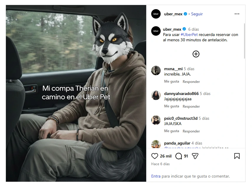 Uno de los ejemplos más claro es la cuenta de Uber México que vinculó el fenómeno con su servicio Uber Pet. De esta manera, buscaron integrar la conversación cultural del momento con una funcionalidad real de la marca, en este caso, como es llevar a tu mascota en tu viaje.